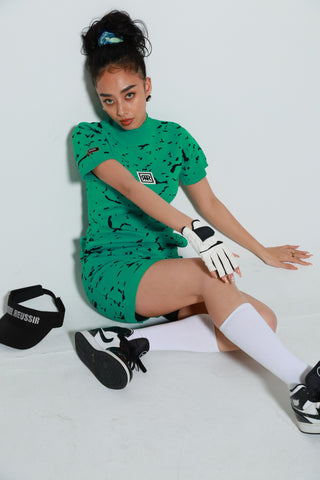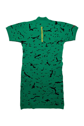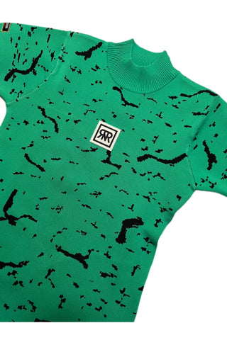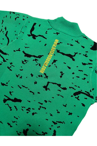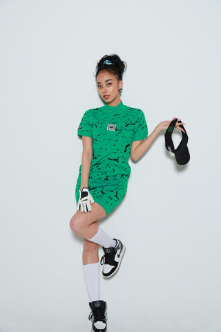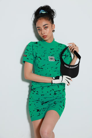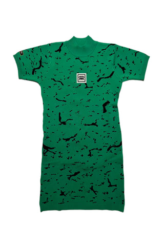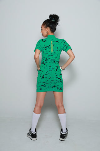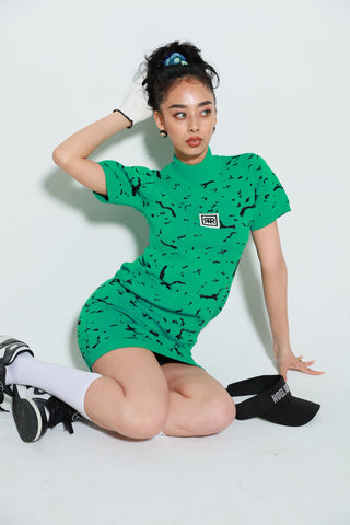全体に散りばめられたテトリスのブロックの様なデザインが目を引く、『パズルプレイニットワンピース』。