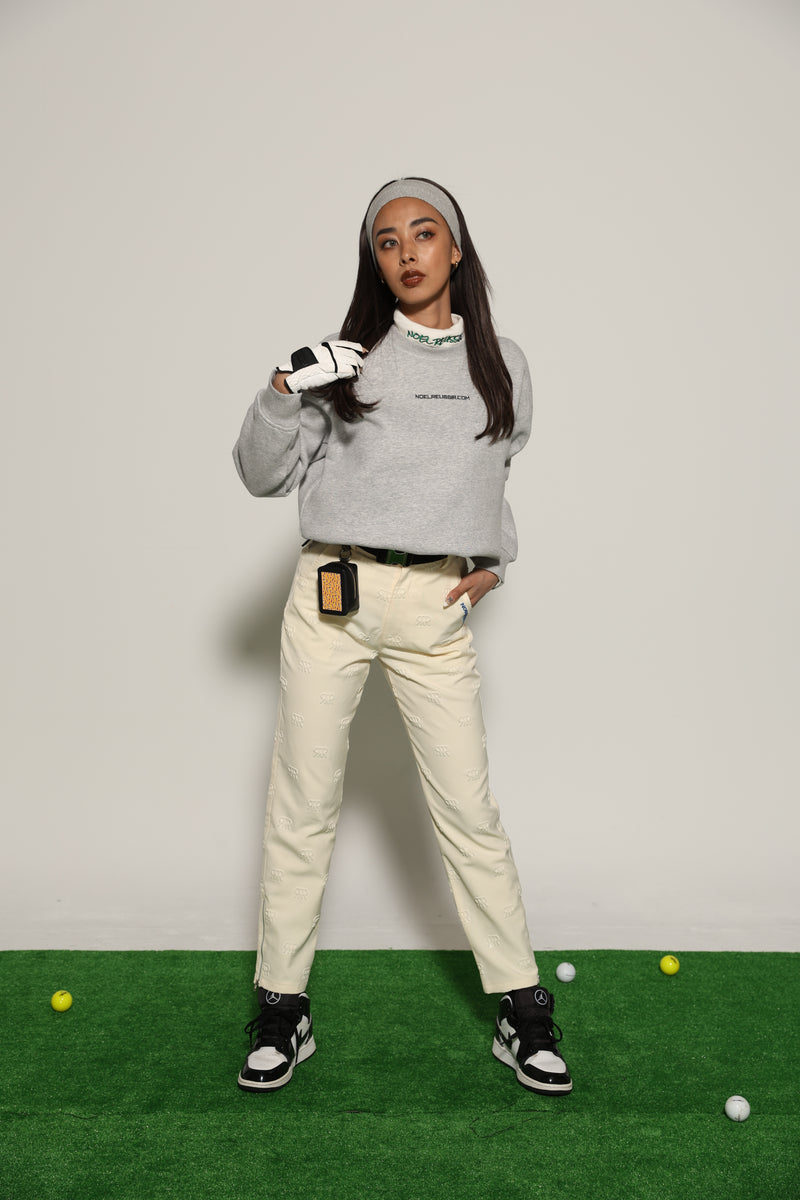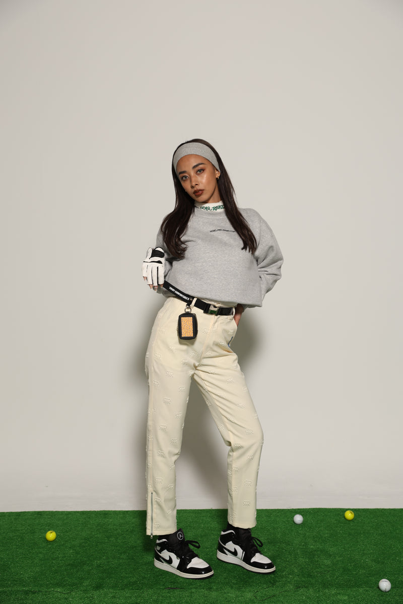 総柄でウェア全体に散りばめられたエンボス加工のNRロゴが、洗練されたスポーティーな印象にモードなスパイスも融合させています。